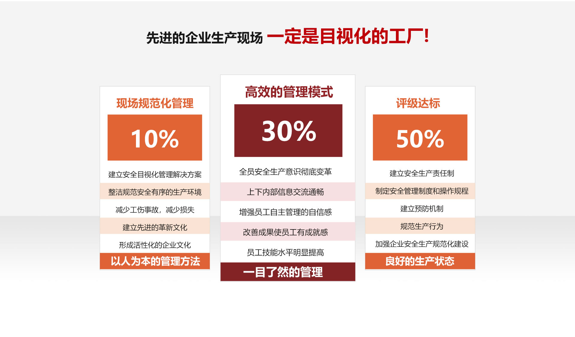 華泰安全目視化管理以安全法律、法規(guī)、標(biāo)準(zhǔn)和危害識別風(fēng)險(xiǎn)評價(jià)為基礎(chǔ),運(yùn)用標(biāo)識警示、6S管理、看板管理、定置管理等方法,結(jié)合企業(yè)VI、生產(chǎn)的特點(diǎn)、安全管理現(xiàn)狀,將各方內(nèi)容融合,策劃一套系統(tǒng)的安全目視化管理解決方案。